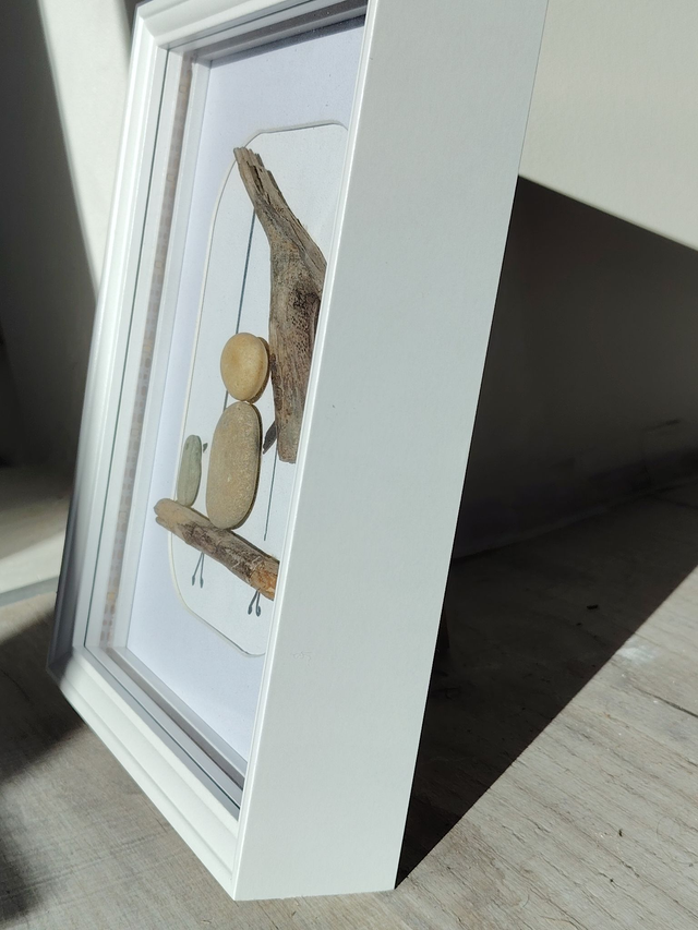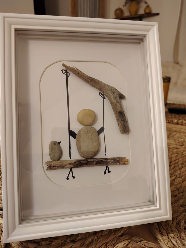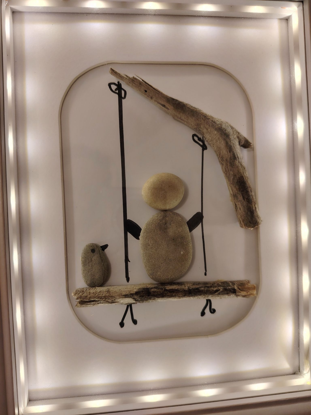 Apportez une touche de poésie et de nature à votre intérieur avec ce cadre décoratif fait main, réalisé à partir de galets, bois flotté et matériaux naturels soigneusement sélectionnés. Chaque élément est assemblé avec minutie pour créer une scène douce et pleine d’émotion : un personnage assis sur une balançoire, accompagné d’un petit oiseau, évoquant la simplicité, l’enfance et la sérénité.